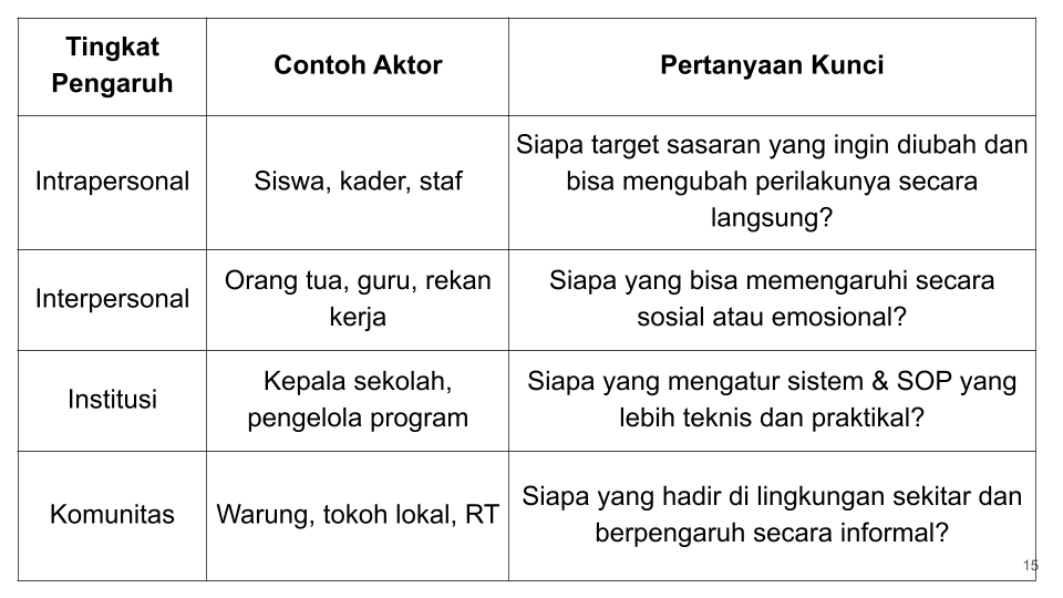 Tujuan: Merancang dan memetakan aktivitas perubahan perilaku secara sistemik dan bertahap di semua lapisan pengaruh dan tahap funnel, serta masuk akal untuk dilakukan.